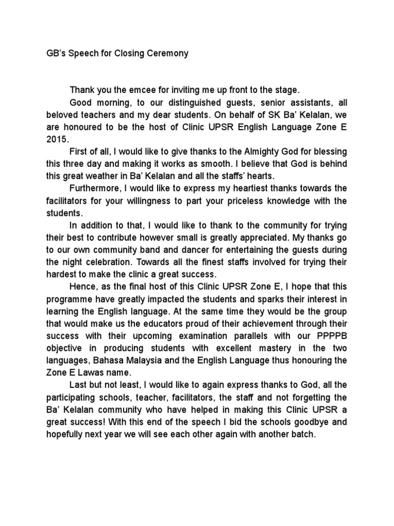 Closing Ceremony Speech / The Speech Of President Jahjaga At The Closing Ceremony Of The Project Empowerment Through Leadership Kusa News Events President Of The Republic Of Kosovo Dr Vjosa Osmani Sadriu / Ceremonial giving of the sign of love and loyalty.. Capable of seating 25,000 spectators, it hosted the opening ceremony on 14 august, was a venue for the cycling event, and also hosted the closing ceremony held on 26 august 2010. If appropriate, consider closing with one of these graduation bible. Then cut it down again. Also known as the i dos. vows: Promises to one another, either handwritten or selected.
